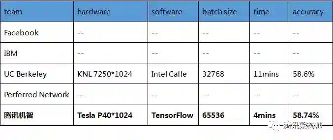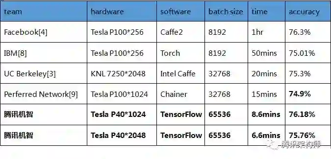 在研究和解决imagenet训练项目中,机智团队小伙伴们通力合作,最终在这个问题上取得了突破。在此要特别感谢团队内小伙伴——TEG兄弟部门运营管理部,香港浸会大学计算机科学系褚晓文教授团队;是大家的精诚团结和专业精神,才得以让我们在这个业界权威基准上取得新的重大突破。
