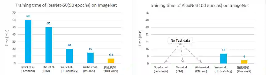 腾讯机智 机器学习平台团队,在ImageNet数据集上,4分钟训练好AlexNet,6.6分钟训练好ResNet-50,创造了AI训练世界新纪录。