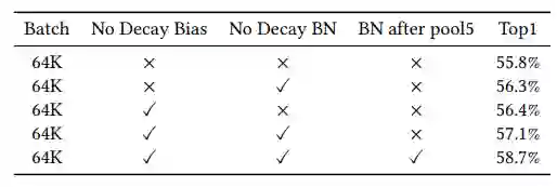 我们在32K下复现了You et al. (2017)的测试结果,但batch size扩展到64K时,训练精度未能达到基准准确性。为了提高在64K下的收敛准确性,我们对参数和模型进行了改进:1) 只对weight做正则化。 2)在You et al. (2017)模型的基础上,进一步改进AlexNet模型。