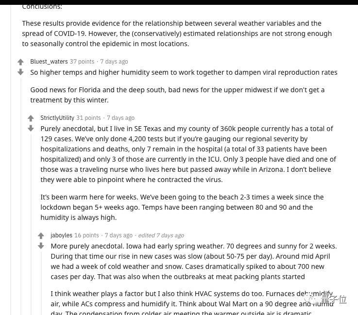 对此,公众焦点是温度升高对自身地区的影响,Reddit讨论集中在温度升高对疫情的控制,而研究者警告,完全依赖温度升高不足以控制住疫情,控制疫情还和管理水平、风俗习惯以及人口密度等因素密切相关。