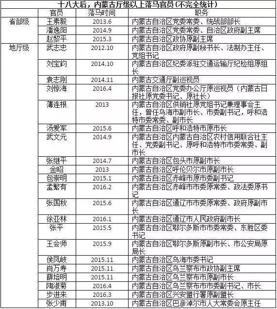 所以,内蒙古的落马官员却相当多,十八大之后,据不完全统计,内蒙古落马的官员如下: