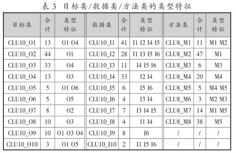 (3)系统聚类。接着,采用方法选择“组内联接”,测量选择“二元T‘平方欧氏距离”1存在“1”1不存在“0”。本研究对144个案例,分别以目标、数据、方法为聚类变量进行了系统聚类。然后,再对每一类聚类结果进行描述性统计,即统计每一个目标类/数据类/方法类的案例集合中,各个目标/数据/方法指标标记的频数。最终,综合频数和频率,以确定每一个目标类/数据类/方法类的目标特征,结果如表3所示。