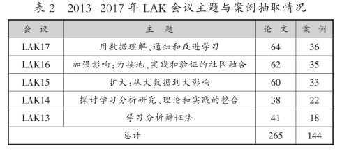 作为学习分析领域最为权威的国际会议之一,LAK会议由学习分析研究协会(Society for Learning Analytics Research,SoLAR)发起并组织。自2011年SoLAR成立以来,每年召开一次。本研究的学习分析实践案例均来自此会议,所选取2013-2017年间LAK会议的主题和案例抽取情况,如表2所示。