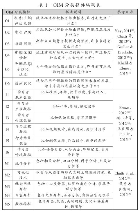 通过梳理国内外关于学习分析实践的典型框架或指导模型,本研究抽取其中常涉及到的目标(简称O)、数据(简称I)、方法(简称M)的分类描述,最终确定了17个OIM分类值,如表1所示。