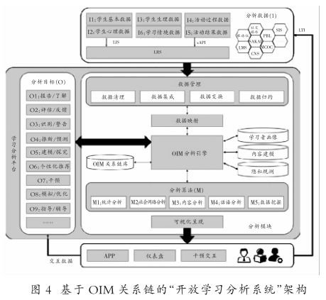 本研究在参考现有开放学习分析模型的基础上,提出了基于OIM关系链的“开放学习分析系统”(OIMbased Open Learning Analytics System,OIMOLAS)[42],如图4所示。OIMOLAS引入揭示学习分析目标、数据和方法之间映射关系的OIM关系链,来增强在不同教育应用问题情境下,开放学习分析操作的目标和过程导向实施流程的程序化和规范性,以确保分析结果的可用性和有效性。