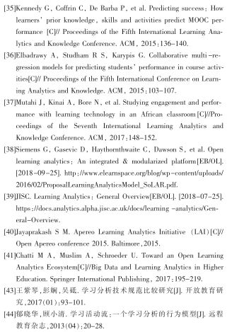 基于此,“开放学习分析(Open Learning Analytics)”这一术语开始出现在由SoLAR发布的2011年愿景文件中。文件提出,要搭建一个集成的模块化平台,来整合异构的学习分析技术[38]。随后,关于开放学习分析的研究开始得到极大的关注。英国联合信息系统委员会(JISC)[39]严基于项目实践,提出了划分为数据收集、数据存储和分析、演示和动作三层的开放学习分析架构(OLAA)。2015年,美国Apereo基金会设计了由“沟通”作为介导的开放学习分析“钻石模型”,包含“收集”、“存储”、“分析”和“行动”四个主要领域[40]。Chatti等[41]研究者则提出了开放式学习分析生态系统的理念,并讨论了实现开放式学习分析的四个要素:用户场景、教育需求、技术架构和平台组件。