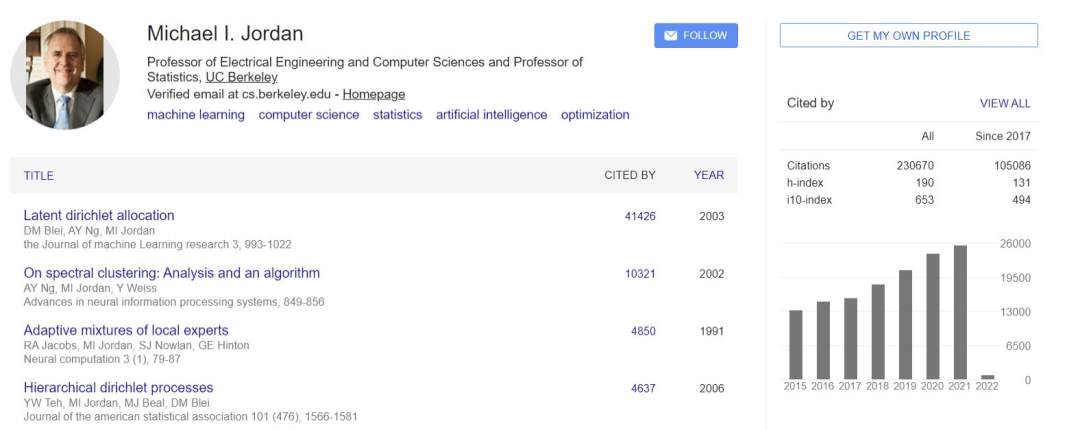 目前,Michael Jordan 是加州大学伯克利分校的杰出教授。此外,他还拥有人工智能促进协会(AAAI)、ASA、CSS、IEEE、IMS、贝叶斯分析协会(ISBA)、美国工业与应用数学学会(SIAM)会士和 UC Berkeley 特聘教授、阿里达摩院学术委员会委员等诸多身份,获得过国际人工智能联合会议(IJCAI)研究卓越奖、David E. Rumelhart 奖、ACM/AAAI Allen Newell 奖、格林纳德随机理论与建模奖等诸多奖项。