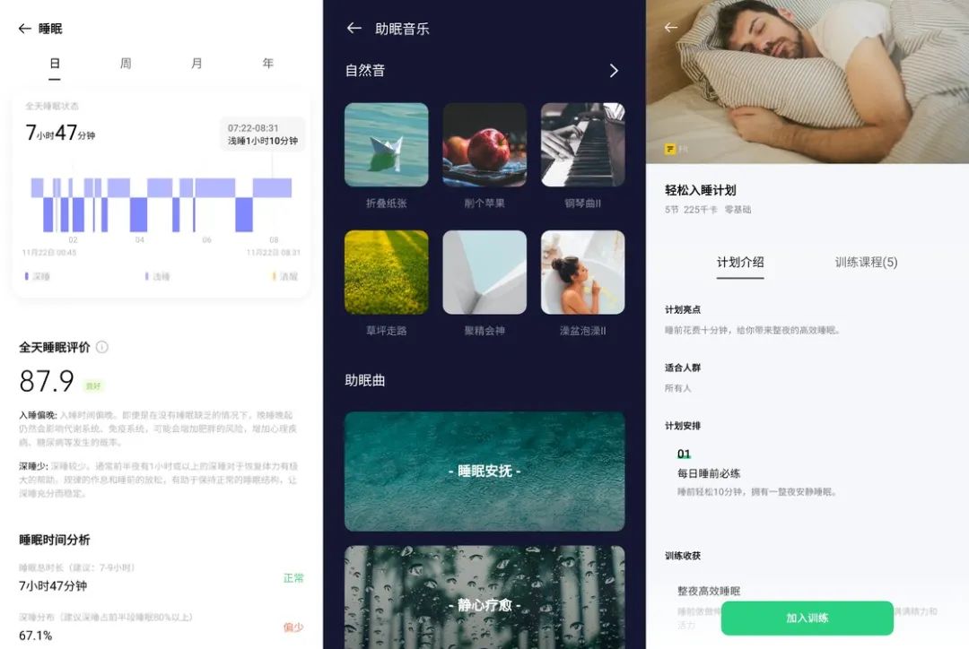 如果你在睡眠上有疑难杂症,HeyTap 健康还内置了多款白噪音助眠音乐、睡眠放松方案和与丁香医生合作的睡眠在线咨询,应该能让你有个好梦。