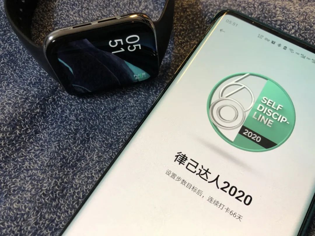 最后,HeyTap 健康中还有更详尽的目标打卡,从吃早餐、拒绝零食、勤洗手等多角度助力健康生活,当然,支持自定义。每日步数达标后也可以在 App 内打卡,有时作为解锁成就的条件,如现在连续打卡 66 天,就可获得「律己达人 2020」限定勋章。