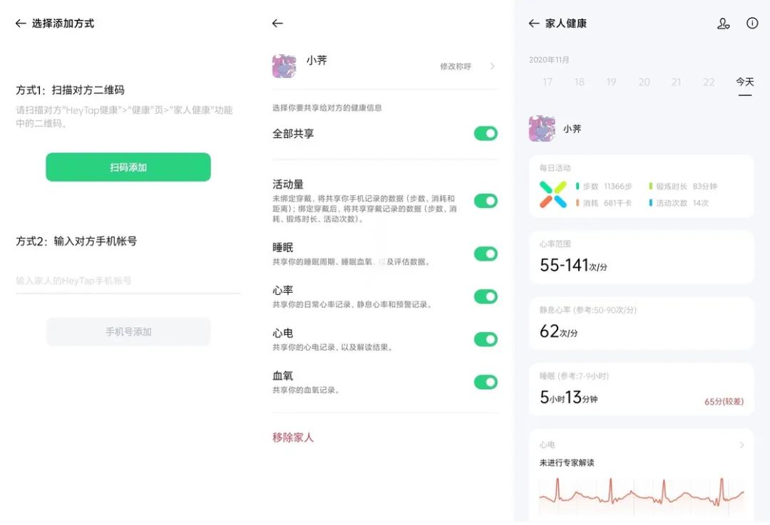 OPPO Watch 在不久前的更新中针对家庭使用场景做了很多优化,通过扫描对方的二维码或输入手机号就能建立家人关系,便于查看彼此的健康信息和评估状况,系统会根据设备型号自动确定可以共享的信息类型。