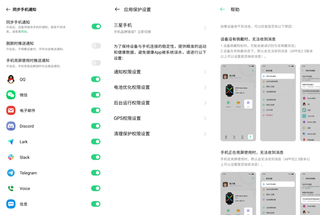 手表的定位首先自然是手机的辅助。在 HeyTap 健康设置中选择想同步哪些 App 的通知后,我大多数时候都只在手表上查收重要消息。不过需要注意的是,默认情况下仅当手机息屏时才会推送通知,我们可以手动更改为即使手机亮屏、手表脱腕,依然在手表上显示未读通知;如果收不到通知,别忘了按照「应用保护设置」中的教程,开启通知访问权限并关闭电池优化。