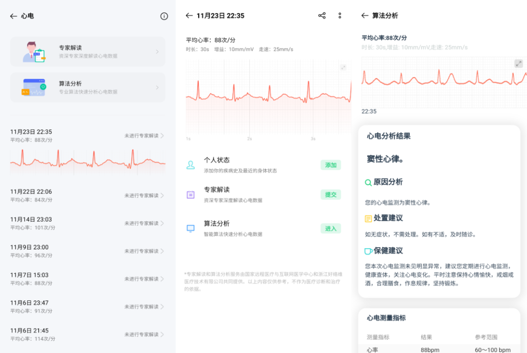 心电图生成后,我们可以进一步提交并进行快速 AI 算法分析,也可以付费请求国家远程医疗与互联网医学中心的医生解读。虽然不论是 AI 算法还是专家远程解读都无法代替医院诊断,但这样的整合能力对于 OPPO Watch 这种第一次做 ECG 功能的产品来说还是相当不错,最重要的是,它总能让我对自己的心脏状况「心里有数」。