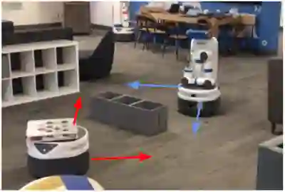 示例:两个独立控制的机器人被障碍物隔开,其共同目标是与彼此会合。这两个机器人如何移动才能会合?每个机器人的示例轨迹分别以红色和蓝色箭头表示。每个机器人根据自己的观察结果独立决定前进的方向