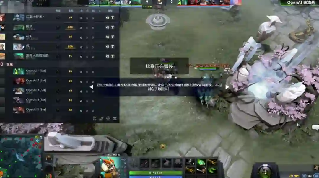 距离比赛正式开始前 52 秒,OpenAI Five 直接在不需要视野的地方插了假眼,跟上一场出现了相同的浪费资源的情况。随后双方爆发了团战,人类方获得了第一滴血。