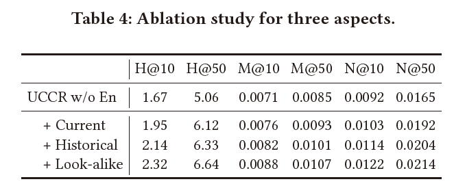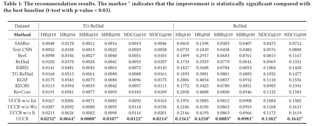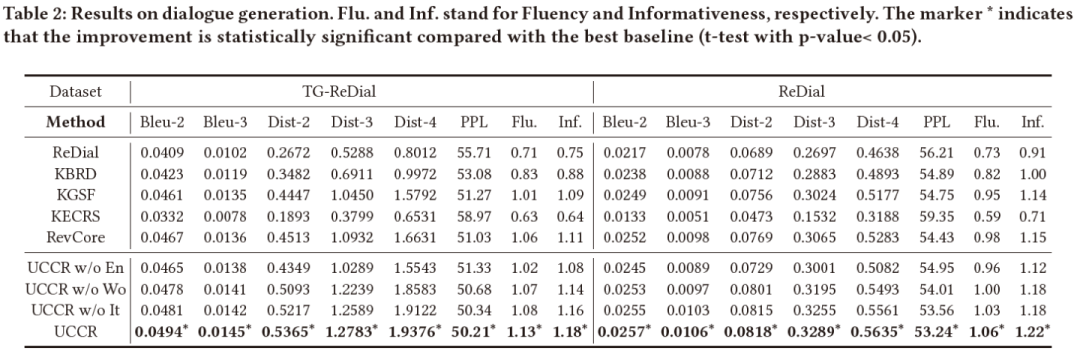 本文在中文、英文公开的对话推荐数据集上进行实验验证UCCR的有效性,实验表明UCCR在推荐和对话任务上相较于SOTA方法均有所提升。同时,UCCR可以很好地应对冷启动场景(即用户当前会话信息缺失时),历史会话和相似用户信息成为了很好地补充。