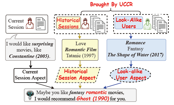 不难看出,以上方法均是利用自然语言理解技术,更好地建模当前对话信息。而作为推荐系统的一种,对话推荐的核心问题也应当是理解用户,建模用户行为。尽管当前对话信息在CRS中至关重要,我们发现用户的多方面(multi-aspect)信息,如用户历史对话、相似用户信息等,可以很好地辅助用户兴趣建模,更全面地理解用户。如下图所示,之前的CRS方法仅基于当前对话捕捉用户兴趣,只能捕捉到用户的基础兴趣偏好:奇幻电影,而无法建模用户隐式兴趣偏好:爱情电影。而这时历史对话信息、相似用户信息则提供了很好地补充。