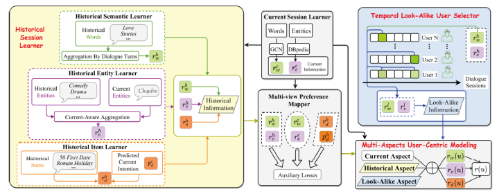 可以看出,不同于前人的CRS方法,我们考虑历史会话信息和相似用户信息,更系统、全面地理解CRS中的用户。