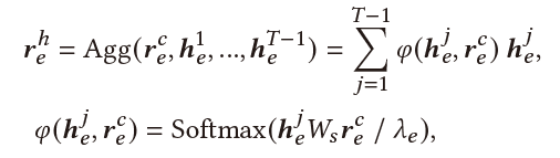 对于第 篇的历史对话出现的实体 ,我们利用R-GCN(具体细节同Current Session Learner部分)得到其表示 ,然后根据 与当前实体表示 的相似度进行加权平均: