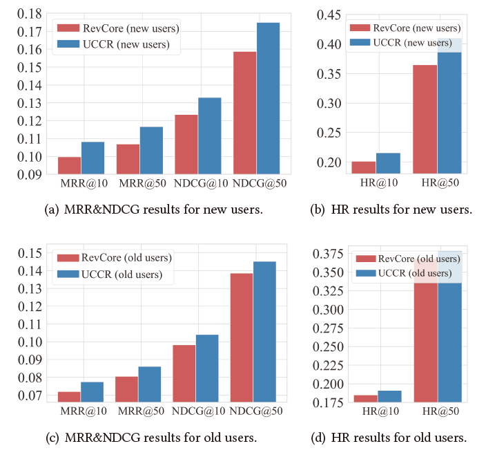 当用户历史信息较少时,我们的方法依然有效。具体地,我们将没有历史对话的用户称为new users,有历史对话的用户称为old users,其在ReDial数据集上表现如下图:
