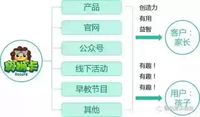 例如,奥狮卡的受众分为客户(家长)和用户(孩子),奥狮卡与受众的接触点有产品、官网、公众号、线下活动等;这些接触点向家长心智传递的是“创造力”、“有用”、“益智”,向孩子心智传递的是“有趣”。