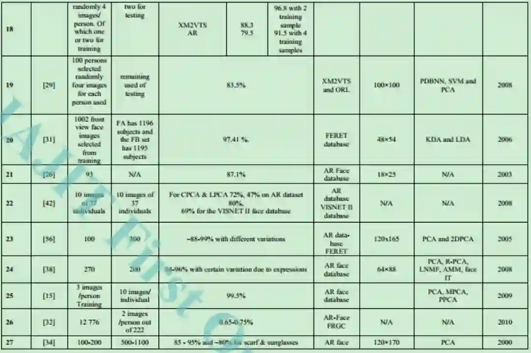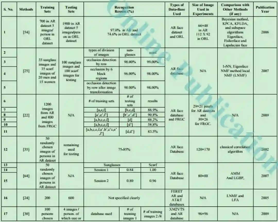 在回顾了不同的方法之后,得出的结论是大部分的工作是在基于部分的方法下进行的。这些方法通过把图像分割为不重叠的子块进而把图像转换到子空间中,然后使用合适的子空间约简技术。确切的说这些方法是PCA,ICA,NMF和LNMF等。同时基于特征的方法包括Ada-Boost 和基于SVM的方法。很少使用基于分形的方法来处理部分遮挡问题。在上面的内容中,主要关注的是人脸识别中的部分遮挡问题并讨论了大量的来自不同研究者的方法。下表给出了上面讨论的技术