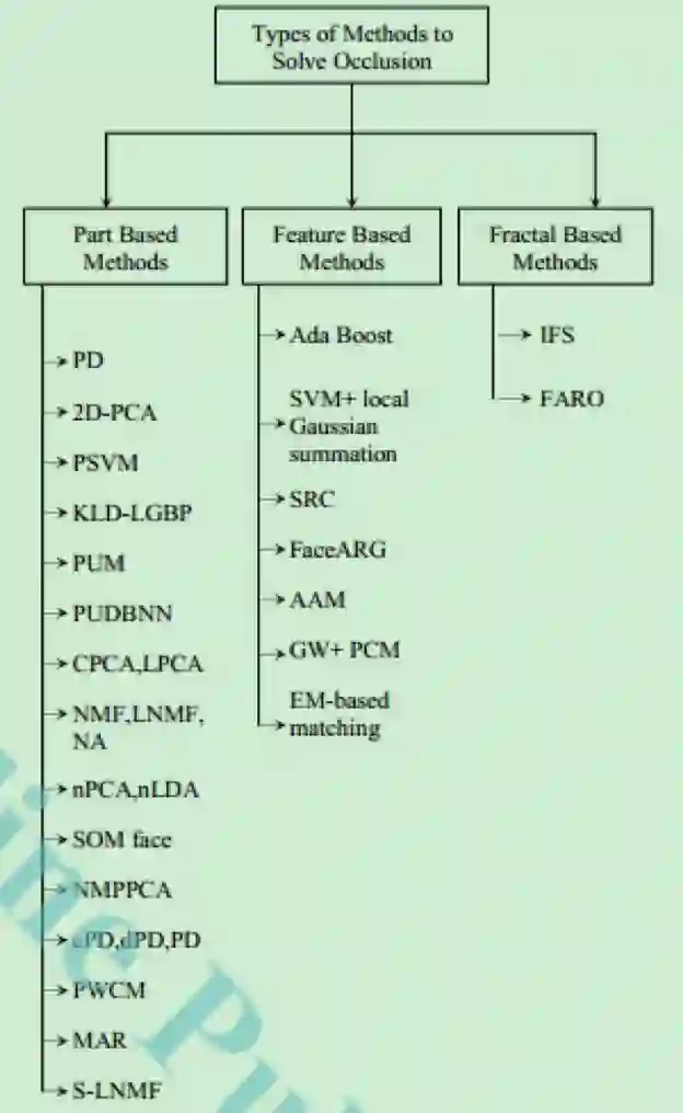 本次技术对部分遮挡的人脸识别问题进行了分类。1)其中基于部分的方法主要有主成分分析(PCA),线性判别分析(LDA),非负矩阵分解(NMF),局部非负矩阵分解(LNMF),独立成分分析(ICA)等;2)基于特征和基于分形的方法考虑了眼睛,鼻子,嘴巴周围的特征然后用于算法的识别阶段。