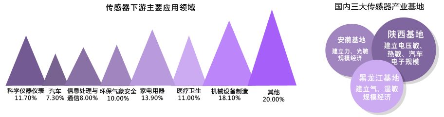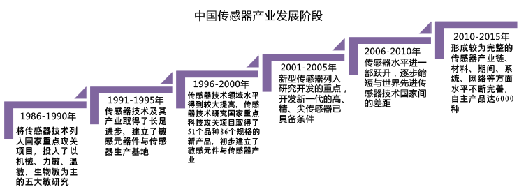 中国已经基本形成较为完整的产业链结构,在材料、器件、系统、网络等各方面水平不断完善,自主产品已达6000种,国内建立了三大传感器生产基地,分别为:安徽基地,陕西基地和黑龙江基地。政府对国内传感器产业提出了加快力度加快发展的指导方针,未来的传感器发展将向着智能化的方向改善。