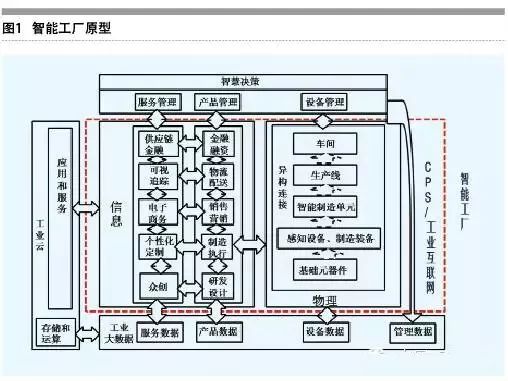 企业基于CPS和工业互联网构建的智能工厂原型,主要包括物理层、信息层、大数据层、工业云层、决策层。其中,物理层包含工厂内不同层级的硬件设备,从最小的嵌入设备和基础元器件开始,到感知设备、制造设备、制造单元和生产线,相互间均实现互联互通。以此为基础,构建了一个“可测可控、可产可管”的纵向集成环境。信息层涵盖企业经营业务各个环节,包含研发设计、生产制造、营销服务、物流配送等各类经营管理活动,以及由此产生的众创、个性化定制、电子商务、可视追踪等相关业务。在此基础上,形成了企业内部价值链的横向集成环境,实现数据和信息的流通和交换。