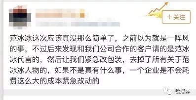 昨日,已有网友在微博上发声称,该公司合作的客户紧急要求撤掉了关于范冰冰的形象。但该网友很快删去了这条微博,也未回复每经影视记者的求证。
