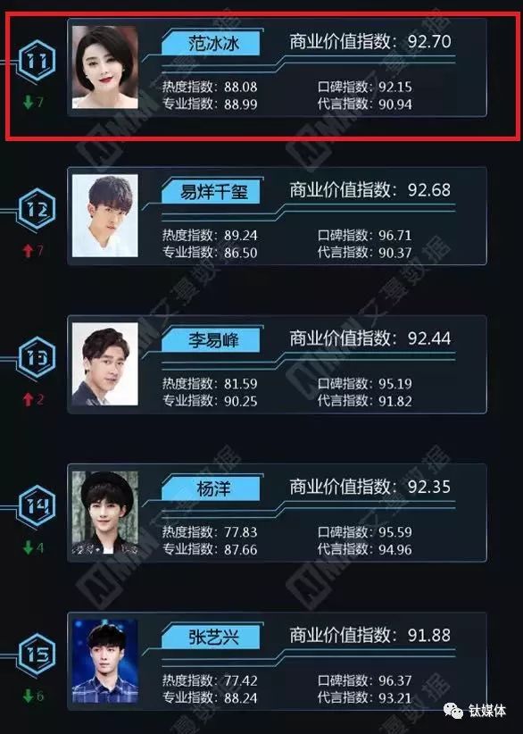 范冰冰的焦点效应不言而喻,她是明星中的明星,其商业价值位居前列。