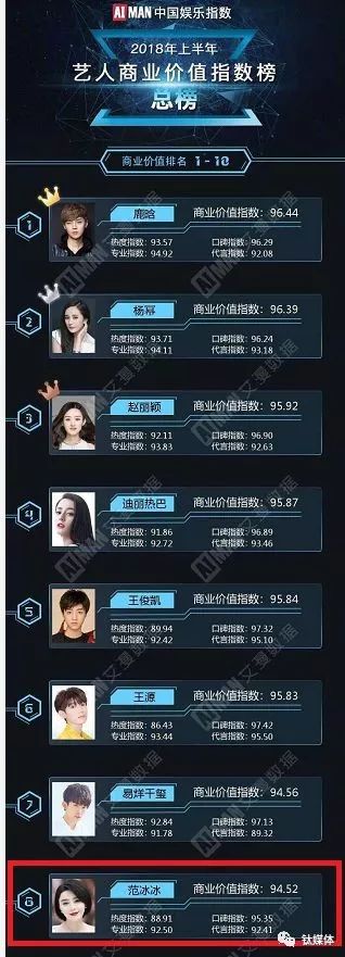 在福布斯官网2017年发布的中国明星收入榜中,范冰冰以3亿元人民币的年收入位居榜首。艾漫数据2018年上半年艺人商业价值TOP50榜单显示,范冰冰排在第八位,商业价值指数是由热度指数、口碑指数、专业指数、代言指数四个维度组成的。