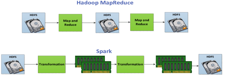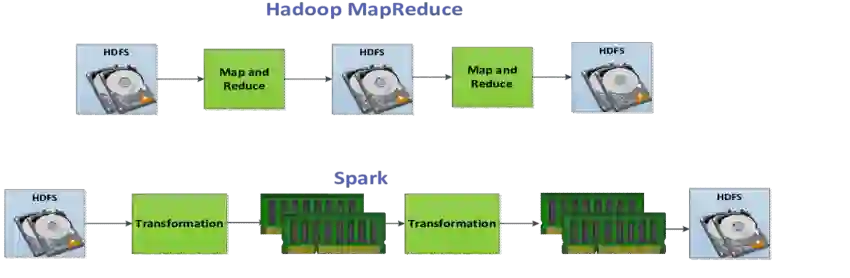 比较形象的对比(并不是说spark不会落盘,在基于DAG图拆分stage时,也会涉及到shuffle,但整体的磁盘IO消耗比MapReduce要低)