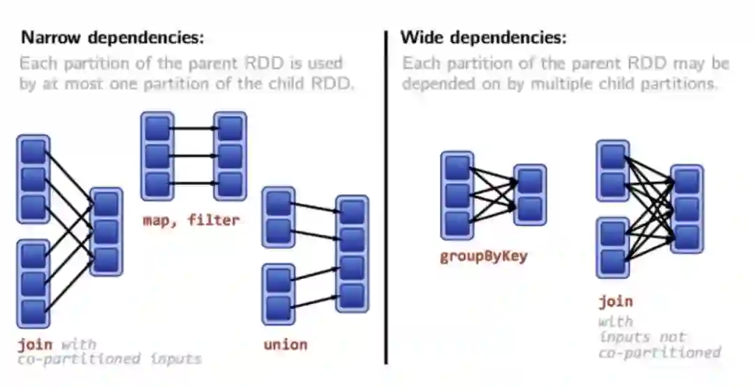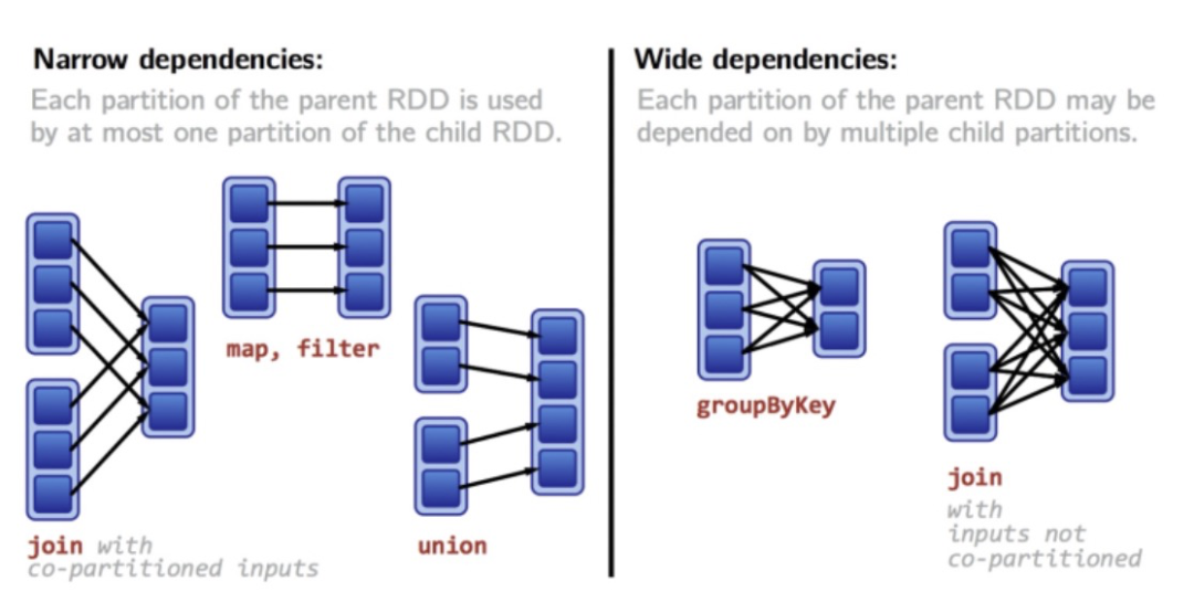 Narrow/Wide dependencies:参考下图,区分的重要依据在于父节点是否会被多个子节点使用。