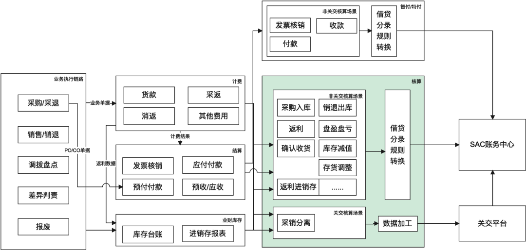 从上图可以看到供应链核算一脚在业务(计费/结算可以理解为财务视角的业务),一脚在财务,职责上既要满足核算团队月结出账的诉求,又要提供业财对账的能力,基于此我们将数据处理统一为如下流程: