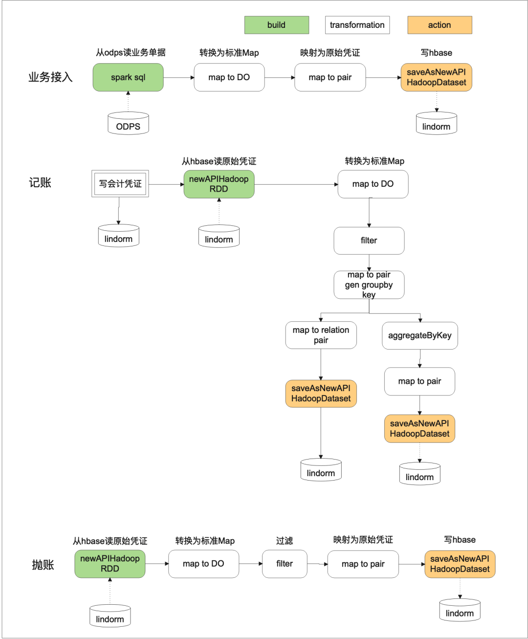 核算接入、记账、抛账等主流程的spark处理逻辑如下所示: