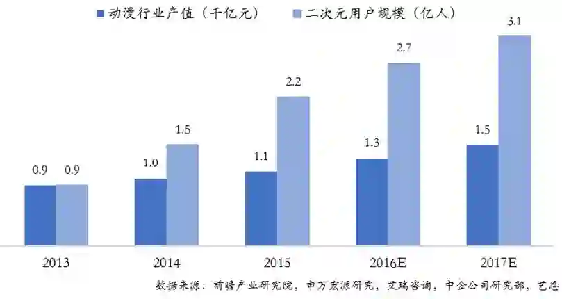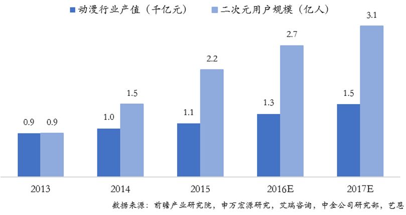 根据相关市场研究数据显示,动漫产业产值规模已从2013年的不足千亿增长到2017年的1,500亿元(估计值),涨幅超过50%,在6,300亿元的文娱业总产值中占比24%,成为其越来越重要的组成部分;另一方面,中国二次元用户已突破3亿,广大的用户基础和日益增强的付费意愿,为产业在变现端提供了更坚实的基础。