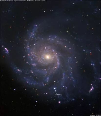 2011年8月24日,美国加利福尼亚州劳伦斯伯克利国家实验室的天文学家在M101星系中发现了一颗明亮的Ⅰa型超新星,其正式编号为SN 2011fe。这颗超新星是利用帕洛玛天文台口径1.2米施密特望远镜发现的,该天文望远镜的极限星等约20.6等,近年来积极投入亮度变化快速的瞬变事件搜寻工作, 即所谓的Palomar TransientFacility,简称PTF 搜寻。PTF于8月23日晚间观测影像中尚未见到M101中有任何超新星,却在隔天24日晚间的观测图像中出现,因此推测这颗超新星是在23日望远镜收工后几个小时内就开始爆发,原始编号为PTF11 kly,位于M101 星系中心以西59角秒、以南271角秒之处。最初观测到的亮度约为17.2等,但这颗超新星亮度变化相当快速,在8月25日达13.8等,27日达12.4等,30日达11.5等,到了31日已达10.8等。