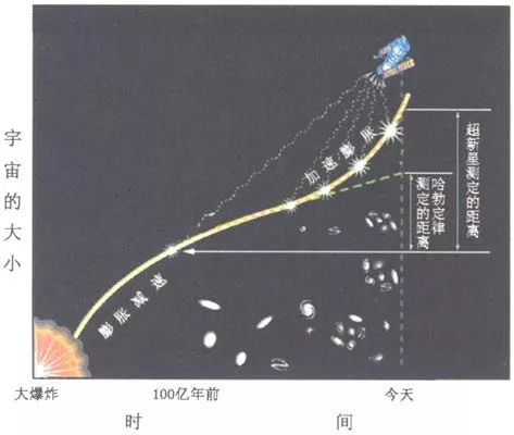 由超新星的观测发现我们的宇宙在加速膨胀示意图。观测发现那些Ⅰa型超新星的亮度比按宇宙减速膨胀预期的要暗(即更远),这意味着遥远的超新星所在星系正在以越来越快的速度远离我们,也就是说,宇宙是在加速膨胀。