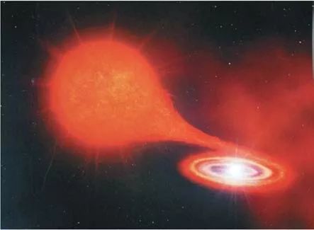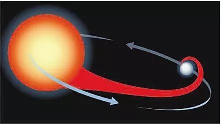Ⅰa 型超新星图示之一:白矮星会通过引力,从它的伴星身上窃取气体