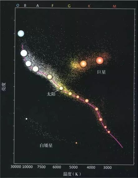 赫茨龙- 罗素图。图中绘出了恒星的温度与亮度的关系。处于对角线上的恒星都处于将氢转变为氦的演化阶段,或称为主序星阶段。当恒星的热核反应无法持续的时候,它将最终演变为白矮星,或者以超新星的形式发生大爆炸。恒星演化的最终结果主要取决于它的质量以及它是否存在于双星体系之中。图的顶部标示了从O到M的字母,表示恒星的光谱类型