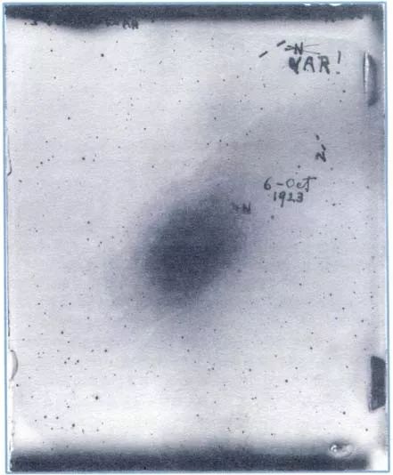 哈勃用胡克望远镜拍摄了这张仙女座星系(M31)的底片。在此底片上,哈勃首次在旋涡星云中发现了造父变星。它最初在右上角标注了一个“N”,表示新星,后来他意识到这是一颗“变星”,于是又标注了“VAR”