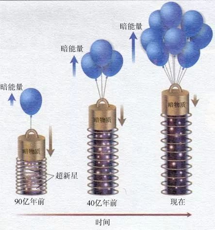 近年曾有科学家提出理论认为,由河外星系超新星观测推测,暗能量的拉力与暗物质的推力之间的竞争始于90亿年前,最终,暗能量逐渐占上风并促使宇宙加速膨胀。