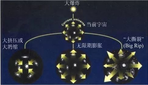 在暗能量作用下,宇宙未来的三种命运走向示意图,即其密度随着时间推移而降低,或维持不变,或者增加。总之,在存在暗能量的情况下,宇宙未来命运取决于暗能量的密度和性质,其最终命运可能是无限膨胀,渐缓膨胀趋于稳定,或者是与大爆炸相对的一个“大坍缩大挤压”;或者也可能膨胀不断加速,称为“大撕裂”,即宇宙尺度在有限的时间内膨胀至无限大,物质连接物、原子、分子甚至亚原子粒子都将被撕裂。据有的研究认为此情形可能在未来宇宙年龄220亿年内发生。目前,由于对暗能量的性质缺乏了解,还难以对宇宙的命运做出肯定的预言。