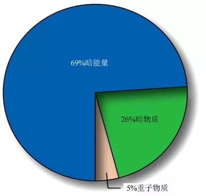 宇宙中的暗能量与暗物质的比例示意图。今天的宇宙由69%的暗能量、26%的暗物质和5%的普通物质组成;我们的身体、我们所用到的一切,我们看到的天上所有的星星,都只属于那5%的宇宙。