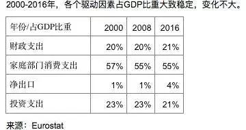 而在欧洲的经济增长中,家庭部门消费支出占到了一半以上,并且非常的稳定,如下表所示: