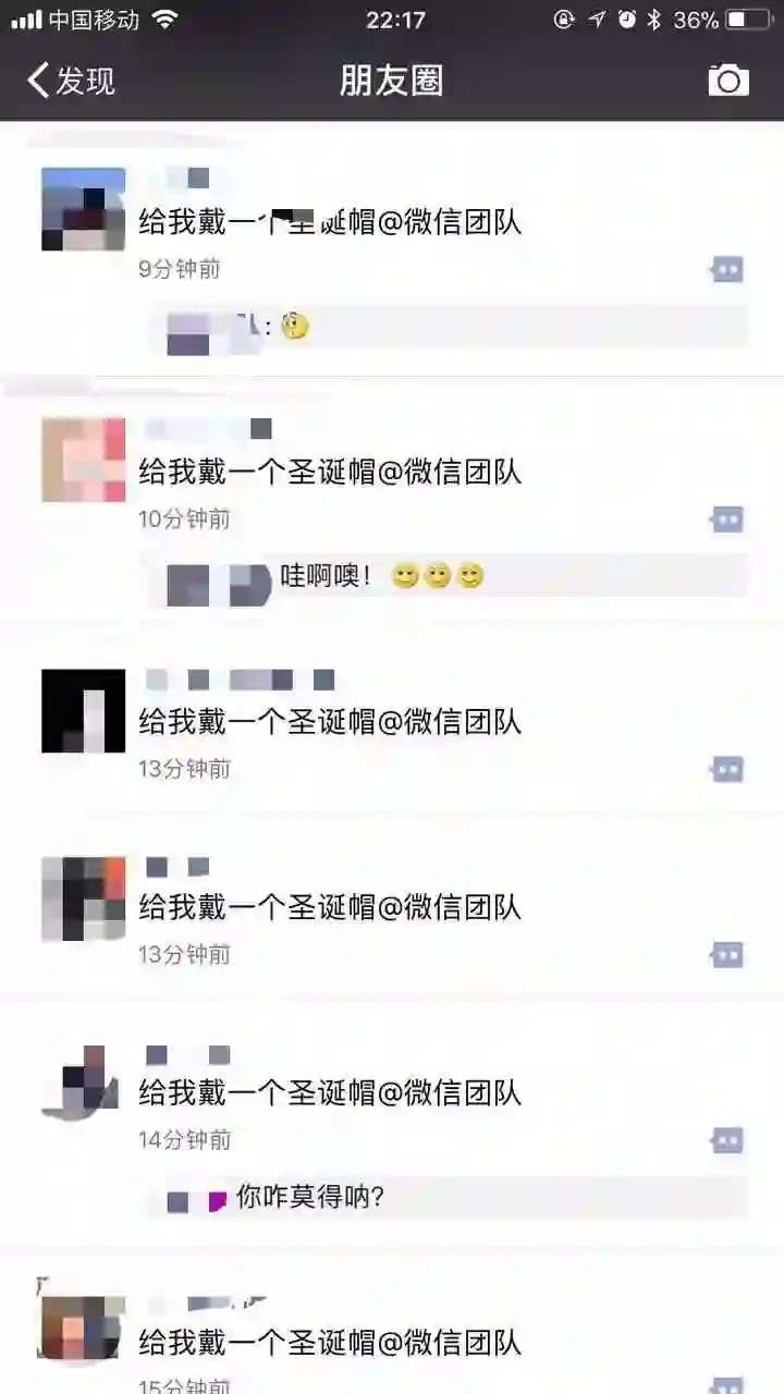 大致来说,当用户在朋友圈发布这样的文字消息:请给我头像一顶圣诞帽@微信官方。