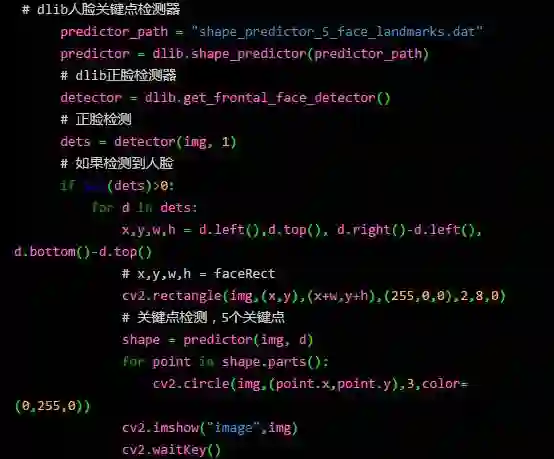 下面我们用 dlib 的正脸检测器进行人脸检测,用 dlib 提供的模型提取人脸的五个关键点,代码如下: