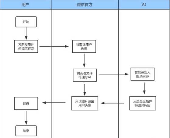 至此,腾讯 AI 理解了该段文本的内容,通过智能图像处理技术,识别到人脸及头部,选择好合适的大小及方向,将提前准备好的圣诞帽图片与头像叠加,这样就生成了一张带圣诞帽的新头像,并将头像传至前端。