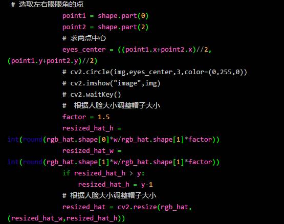 我们选取两个眼角的点,求中心作为放置帽子的 x 方向的参考坐标,y 方向的坐标用人脸框上线的y坐标表示。