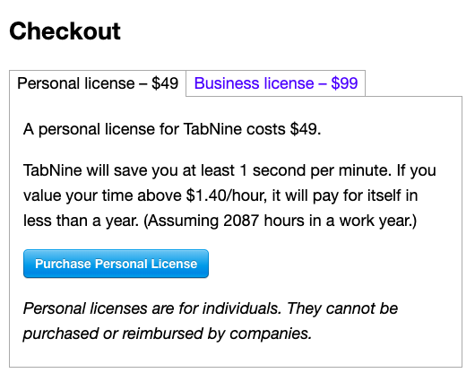 网站上写道:“TabNine 每分钟至少可以为你节省 1 秒钟。如果你认为你的时间价值超过 1.40 美元/小时,它将帮你在不到一年的时间内收回成本。“